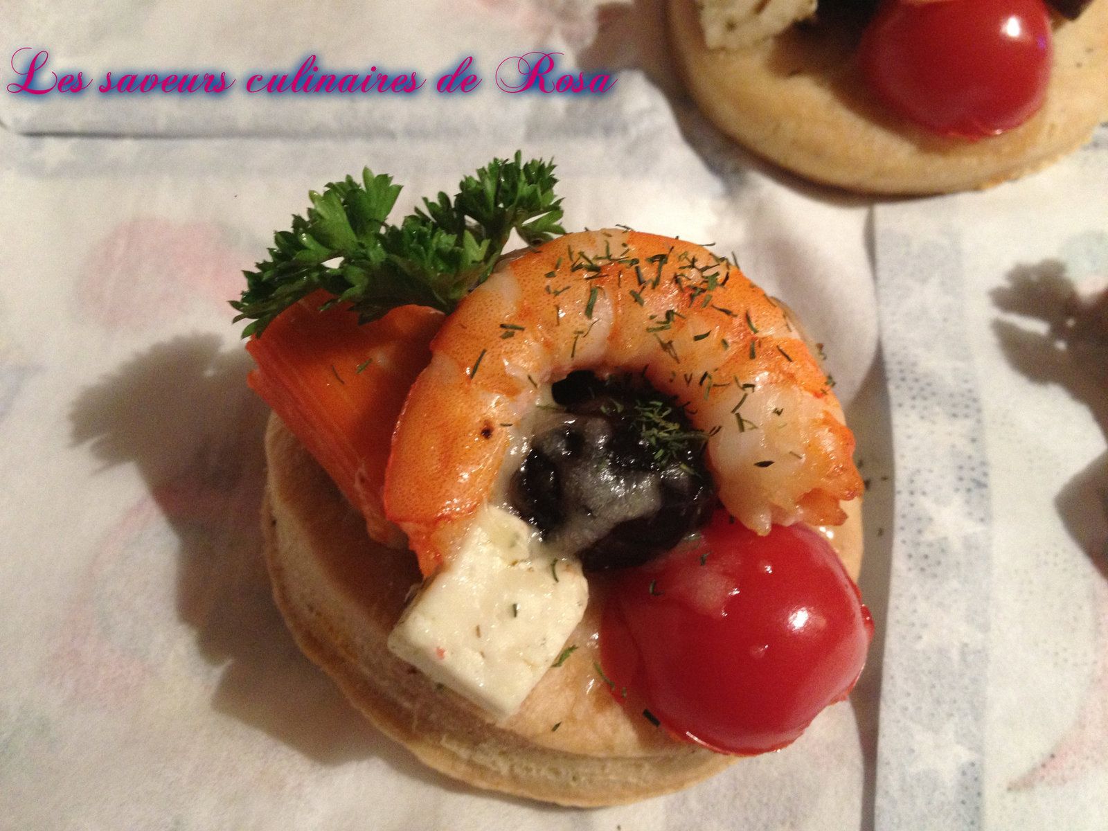 - Décorez chaque tartelette d'une olive, une crevette, un demi bâtonnet de surimi, un cube de salakis, une demi tomate cerise arrosé d'huile d'olive parfumé au basilic, 2/4 de champignon, et une branche de persil frisé