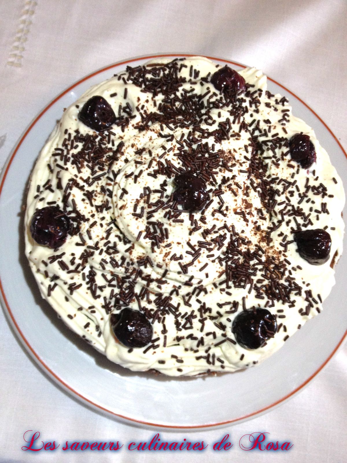 à la maison et tout de suite j'ai pensé à faire la forêt noire pour la première fois, normalement la déco se fait avec des coupeaux ou des cigares de chocolat mais j'en avais pas, du coup j'ai fais avec les moyens du bord