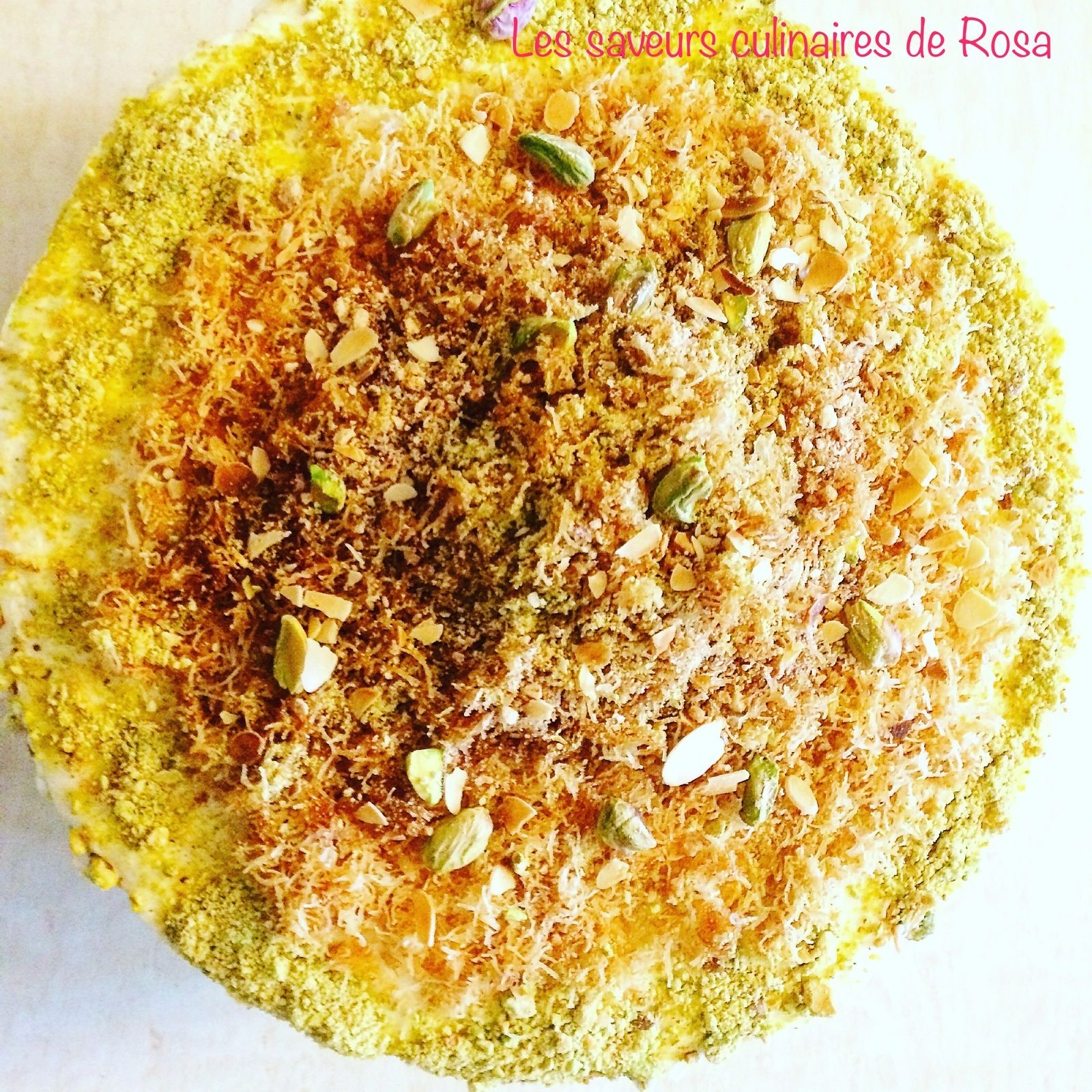 - Quand le cheesecake est bien pris, décorez en émiettant le reste la kunafa grillé sur le cheesecake